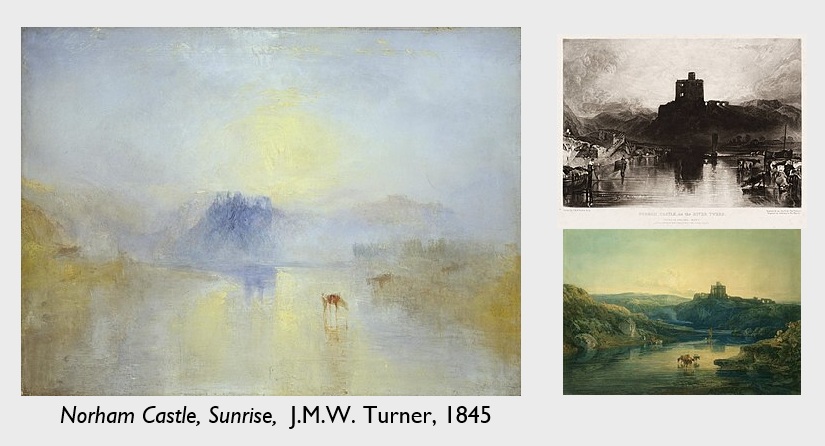 Este trabajo es un pequeño homenaje a su tema “Norham Castle – Sunrise” realizado en 1845, una de sus obras inacabadas, y que tras revisar sus otros apuntes de ese mismo lugar me permití terminarla con un formato que repetía sus medidas y todos los elementos compositivos.
