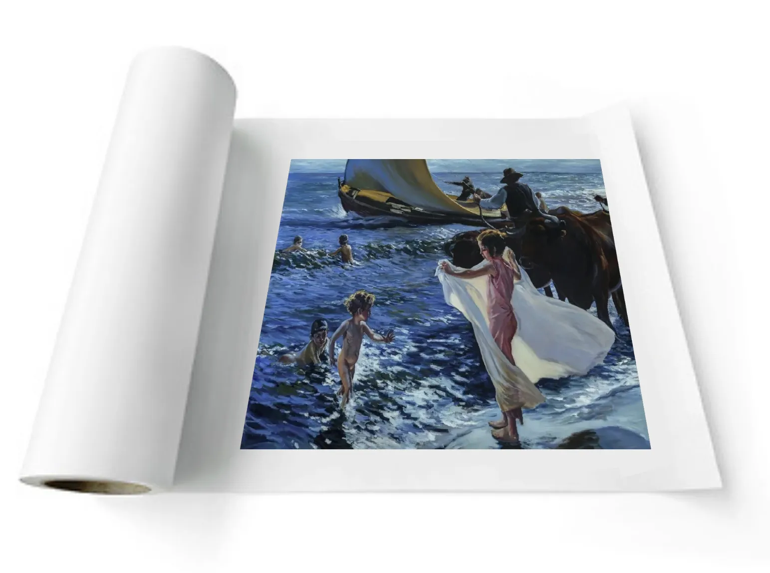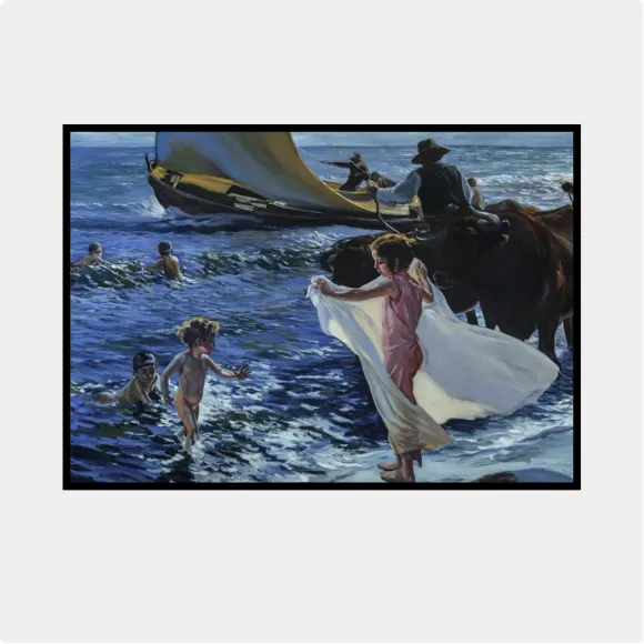 Joaquín Sorolla pintó el original de “La hora del baño” en 1904, en uno de sus periodos más productivos. La obra es un compendio de temas, representados en obras anteriores. Quizás por este “corta-pega” algunas proporciones y perspectivas se encuentran en conflicto.