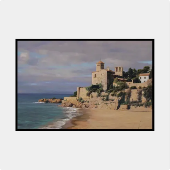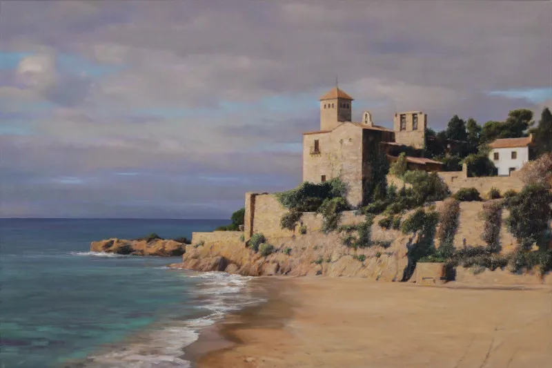 El castillo de Tamarit, en Tarragona, ofrece a los artistas y a quien lo contempla un skyline fantástico desde cualquier vertiente y hora del día. Yo he decidido plasmarlo en soledad, sin bañistas ni embarcaciones, acompañado de las luces matinales y un mar en calma. Utilizando una técnica hiperrealista para intentar transmitir lo más fielmente posible la belleza de ese entorno.